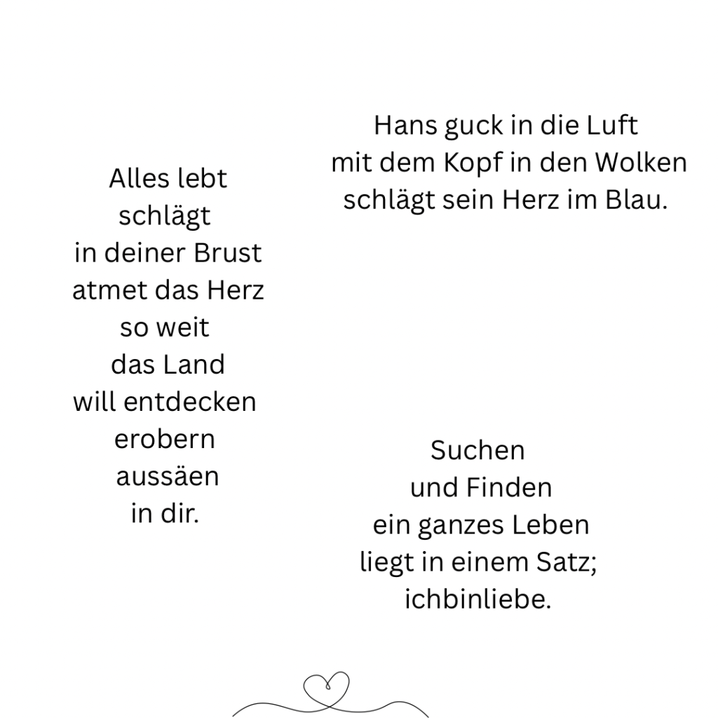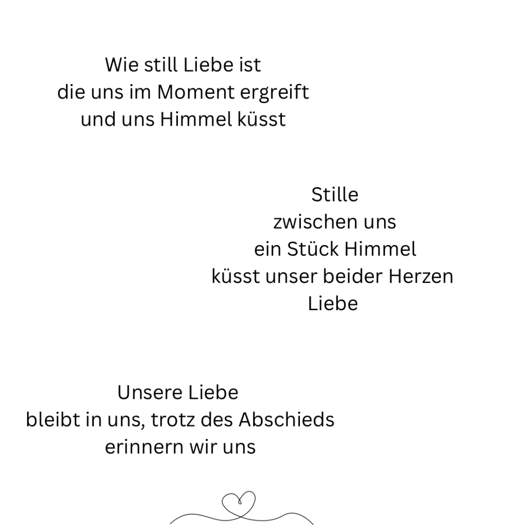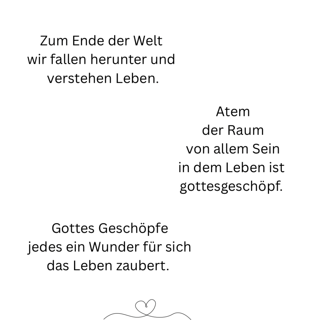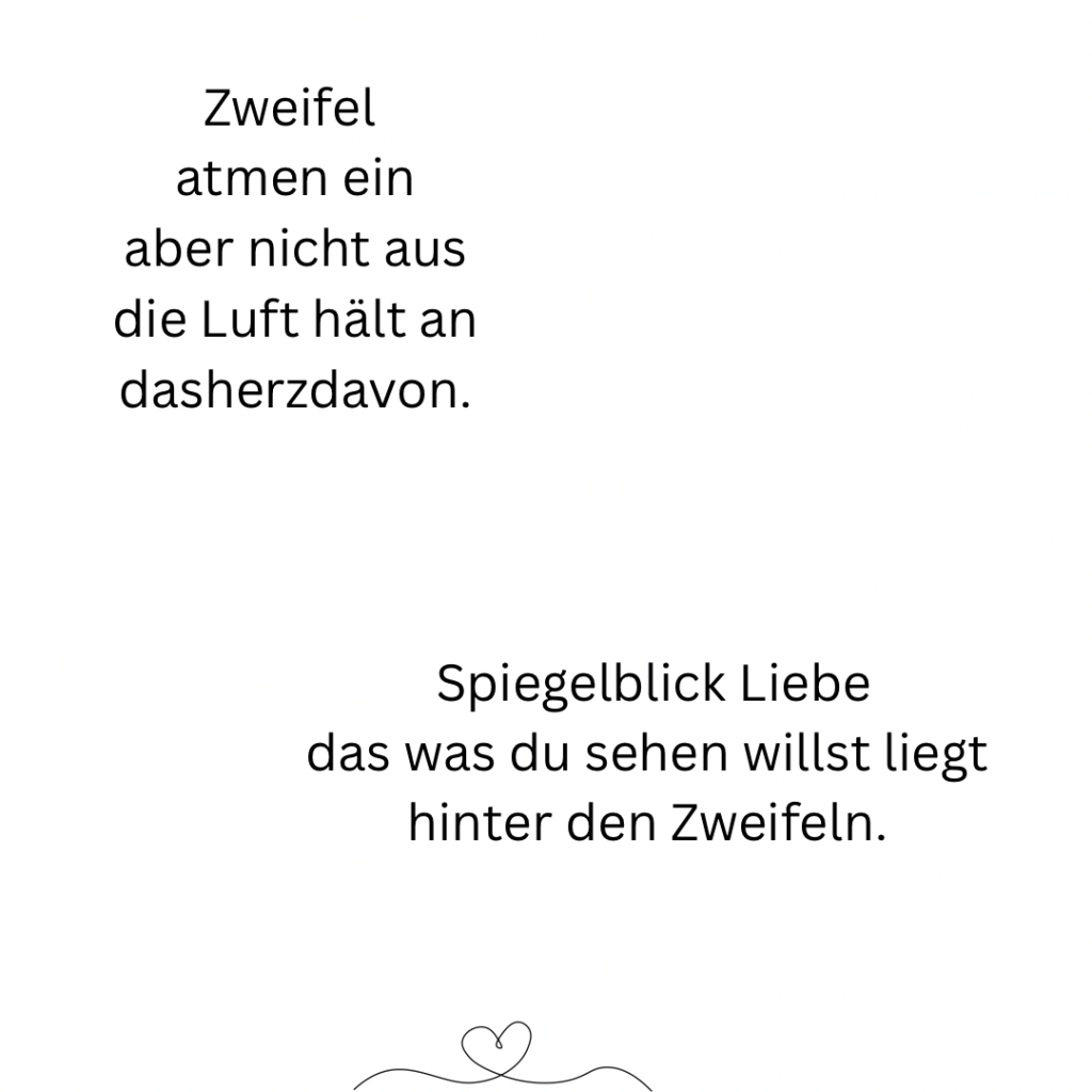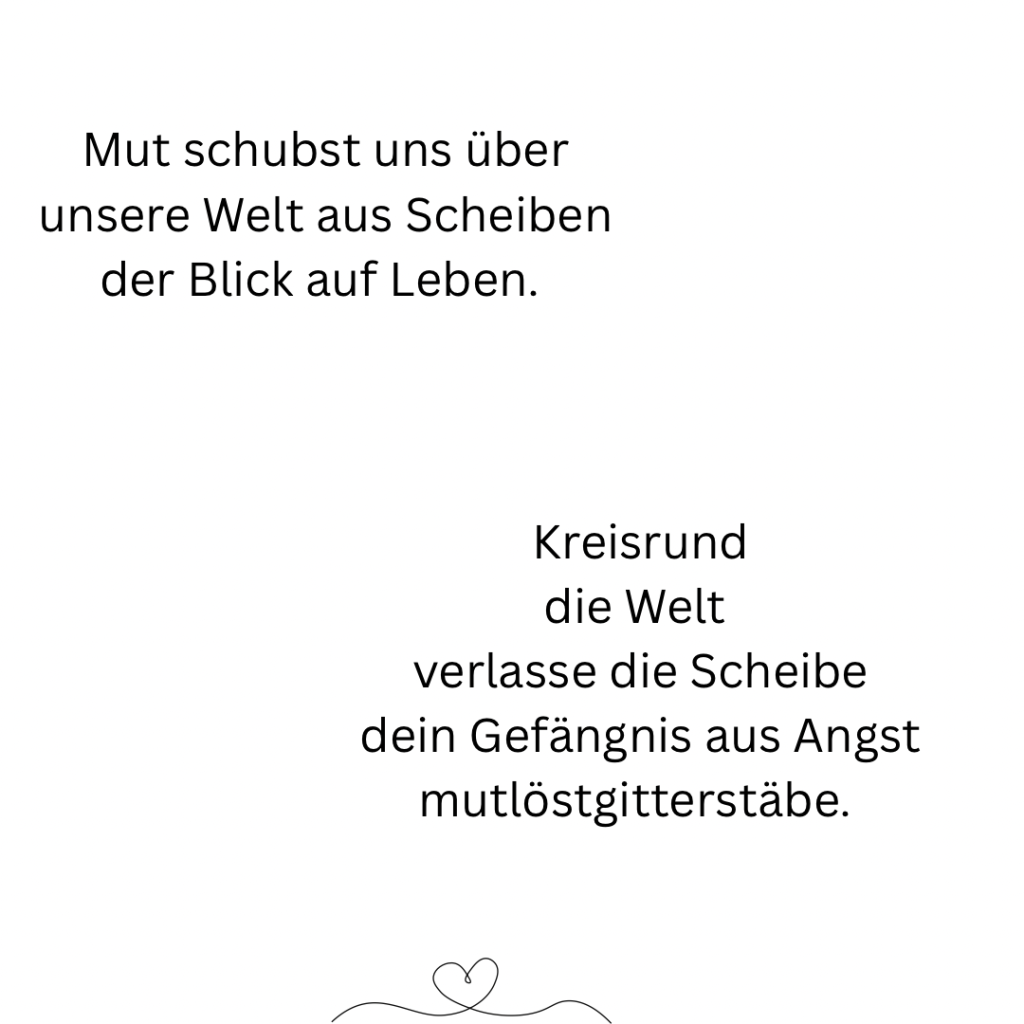 Doch da ist dieses Gefühl, diese Stimme, die immer wieder spricht. In der Stille, wenn sie alleine ist und ihren Herzschlag spürt. M-U-T, der leise flüstert und sie verändert. Mit jedem Schlag. Sie weiß, dass eines Tages ihre Stimme lauter ist, als ihre Zweifel und ihre Angst. Der Mut wird das erste Wort sprechen, um den Weg zu gehen, auf dem sie ihre Hüllen fallen lässt. Herzschlag für Herzschlag.