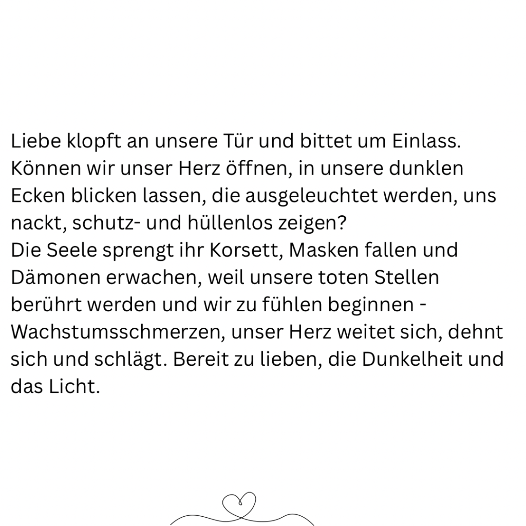 Der erste Schritt. Soll sie es wagen oder nicht? Sich zu zeigen, wie sie ist. Solange schon sucht sie nach echter Verbindung, spürt ihre Sehnsucht nach Tiefe in ihren Beziehungen. Doch immer wenn sie sich vornimmt sich hüllenlos zu zeigen lähmt sie ihre Angst. Was, wenn andere sie nicht mögen, so wie sie ist, weil sie nicht gut genug ist und nicht liebenswert genug. Also lässt sie es und spielt weiter ihre Rollen.