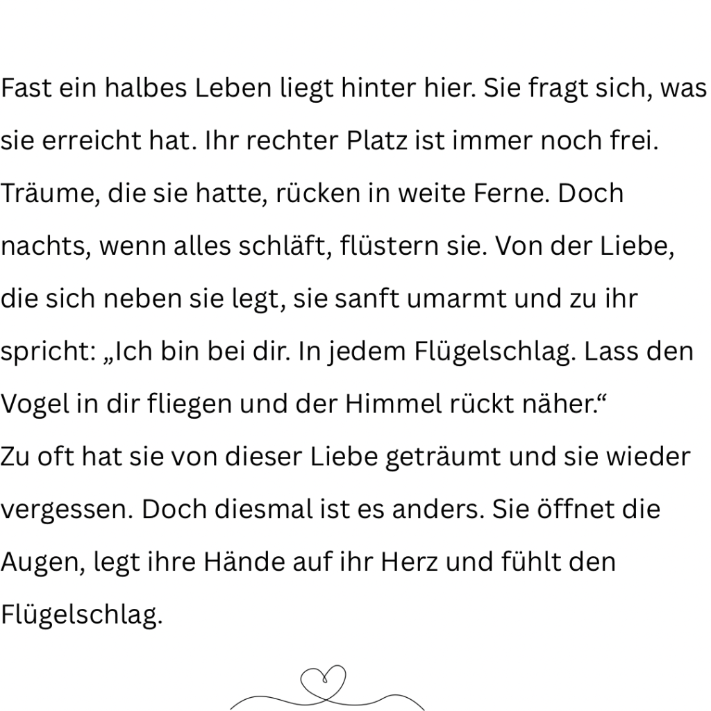 Am frühen Morgen klingelt sein Wecker. Er macht sich für die Schule fertig und geht in die Küche. Seine Eltern sind bereits auf dem Weg zur Arbeit, auf dem Tisch steht seine Brotdose. Auf einmal spürt er einen Kloß im Hals, der immer schwerer wird und schließlich in sein Herz rutscht. Schnell packt er sein Essen in den Schulranzen, verlässt das Haus und fährt mit seinem Fahrrad zu Schule. Dort angekommen schließt er sein Fahrrad ab und geht er zum Klassenzimmer. Er setzt sich auf seinen Platz und versucht dem Unterricht zu folgen. Doch er kann sich konzentrieren. Sein Kloß wird immer fester und nimmt an Schwere zu. Soll er später Herrn Umut davon erzählen? Nach Schulschluss geht er zum Lehrerzimmer, sein Vertrauenslehrer wartet bereits auf ihn. Sie gehen erneut im Schulpark spazieren. Nach den ersten paar Metern fasst sich Sebastian ein Herz und öffnet sich gegenüber Herrn Umut. Er erzählt ihm, was gestern Abend geschehen ist. „Du hast also deiner Wut einen Namen gegeben und sie gefühlt. Das ist toll.“ „Hmm mag sein, doch jetzt habe ich einen Kloß in meinem Hals und alles ist irgendwie schwer in mir.“ „Vielleicht bist du traurig?“ „Traurig?“ „Ja, so nennt man das Gefühl, dass du beschreibst.“ „Na toll. Da ist mein Rot besser. Ich will nicht traurig sein.“ „Das will niemand, doch alle Gefühle sind wichtig, weil sie uns etwas zeigen.“ „Und was?“ „Das erzählt uns die Stille.“ „Wie kann Stille erzählen?“ Lass uns weitergehen. Wir sind gleich da. Dann zeige ich es dir“ Herr Umut führt ihn zu einem freien Feld, auf dem er im Schneidersitz Platz nimmt. Sebastian ist verwirrt und blickt seinen Vertrauenslehrer fragend an. „Setz dich neben mich“ Zögerlich setzt er sich neben ihn. „Nun schließe die Augen.“ „Wozu?“ „Um die Stille zu hören.“ Sebastian schließt widerwillig die Augen. Sofort schießen ihm tausend Dinge durch den Kopf. Seine Gedanken wechseln so schnell, dass er ihnen kaum folgen kann. Mal brennt es ihm, mal ist alles ganz schwer. „Ich kann das nicht. Da ist so viel in meinem Kopf.“ „Das ist normal. Das geht uns allen so, wenn wir still werden. Lass deine Gedanken einfach kommen und gehen. Wie Wolken am Himmel.“ Sebastian gibt seinen Kampf gegen die Stille auf. Er lässt seine Gedanken wie Wolken ziehen und wird ruhiger. Nach einer Weile fühlt er sich warm und leicht. Hier in der Stille ist alles in Ordnung. Keine Eltern, die nie für ihn da sind, kein Zimmer, in dem er stundenlang allein mit seinen unzähligen Spielsachen sitzt. Er fühlt Leichtigkeit, wird eins mit allem und vergisst die Zeit. Schließlich holt ihn Herr Umut ins Hier und Jetzt zurück. Er soll bis 10 zählen, bevor er seine Augen öffnet. Danach machen sich beide auf den Rückweg. Währenddessen unterhalten sie sich über die Stille, die sie miteinander geteilt haben. „Also, nachdem sie gesagt haben, dass ich mir meine Gedanken als Wolken vorstellen soll, wurde es stiller und klarer in meinem Kopf. Ich habe weder Brennen noch Schwere in mir gespürt. Der Kloß in meinem Hals ist auch verschwunden. Alles war still und irgendwie leicht.“ „Das freut mich. Weißt du Sebastian, Stille ist ein Geschenk. Wenn wir wir still werden, können wir den Himmel in uns spüren. In diesem Moment gibt es nur Ruhe und Frieden.“ Sebastian nickt. „Wenn es doch immer so wäre“, sagt er. „Du kannst dir bewusst Momente schaffen, in denen es so ist. Immer wenn du dein Brennen oder deine Schwere spürt, siehst, schließe die Augen und nehme wahr, was in dir passiert. Dabei denk daran, dass die Gedankenwolken Kommen und Gehen, wenn wir ihnen nicht folgen. Du wirst sehen, dass alles klarer wird. Vielleicht verstehst du sogar, woher deine Schwere kommt?“ „Meinen Sie?“ „Das sehen wir Morgen. Es ist Zeit nach Hause zu gehen.“ Sie verabschieden sich am Schultor und Sebastian fährt auf seinem Rad davon.