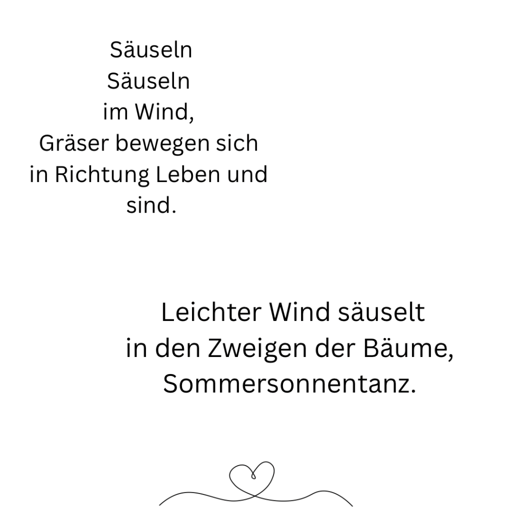 Ich würde mich als emphatische und entspannte Person bezeichnen, die versucht, ihre Erlebnisse in Wort und Schrift darzustellen. Also alles was mein Herz in irgendeiner Art und Weise berührt, verarbeite ich schriftlich.