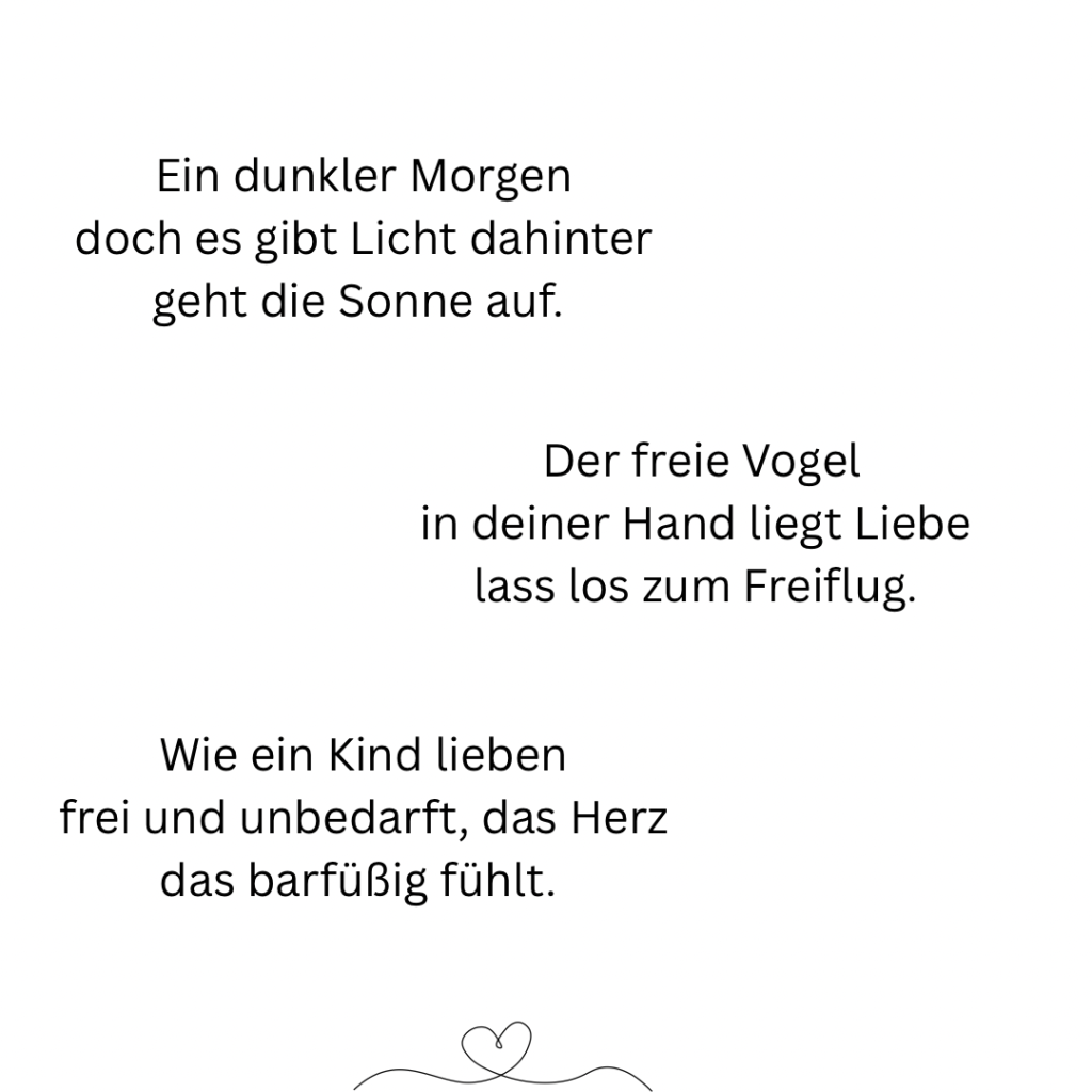 Ich bin kein Meister der Poesie. Manches mag sich holprig anhören, aber so ist mein Schreibstil. Ich bin auch nicht festgelegt auf eine Art von Text, jedenfalls noch nicht. Ich probiere gerne mal aus, dass merkt man auch an meiner Website: Sie ist recht bunt. Ich denke gerne bunt, denn für mich ist es das Leben auch. Mich freut es einfach, wenn der ein oder andere etwas mit meinen Texten anfangen kann oder sich vielleicht sogar darin wiederfindet. Viel Spaß beim Lesen. Und danke für euren Abstecher in meine kleine, bunten Welt. Vielleicht bis bald. 🤗 Lene