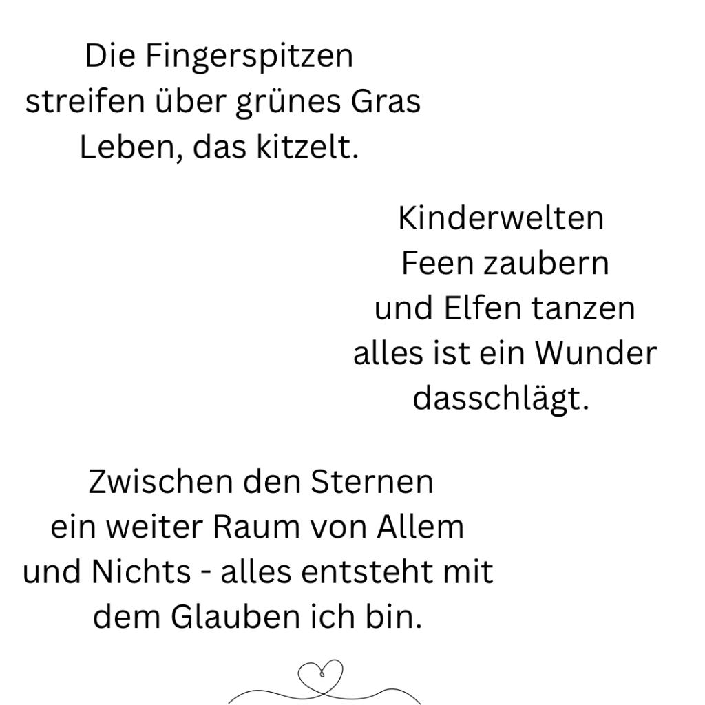 Ich bin kein Meister der Poesie. Manches mag sich holprig anhören, aber so ist mein Schreibstil. Ich bin auch nicht festgelegt auf eine Art von Text, jedenfalls noch nicht. Ich probiere gerne mal aus, dass merkt man auch an meiner Website: Sie ist recht bunt. Ich denke gerne bunt, denn für mich ist es das Leben auch. Mich freut es einfach, wenn der ein oder andere etwas mit meinen Texten anfangen kann oder sich vielleicht sogar darin wiederfindet. Viel Spaß beim Lesen. Und danke für euren Abstecher in meine kleine, bunten Welt. Vielleicht bis bald. 🤗 Lene
