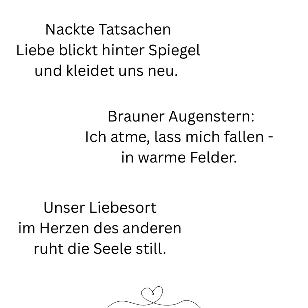 Ich bin kein Meister der Poesie. Manches mag sich holprig anhören, aber so ist mein Schreibstil. Ich bin auch nicht festgelegt auf eine Art von Text, jedenfalls noch nicht. Ich probiere gerne mal aus, dass merkt man auch an meiner Website: Sie ist recht bunt. Ich denke gerne bunt, denn für mich ist es das Leben auch. Mich freut es einfach, wenn der ein oder andere etwas mit meinen Texten anfangen kann oder sich vielleicht sogar darin wiederfindet. Viel Spaß beim Lesen. Und danke für euren Abstecher in meine kleine, bunten Welt. Vielleicht bis bald. 🤗 Lene