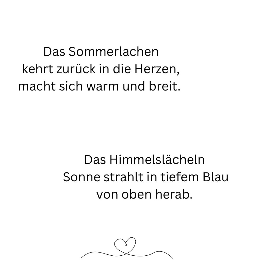 Der Mond setzt zum Nachtflug an. Zwischen den Sternen leuchtet ein Stück Unendlichkeit. Susi neigt den Kopf zum Himmel und hebt die Arme. Mit geschlossenen Augen lässt sie sich von der Stille, die sie umgibt, tragen. Nichts ist wichtig, außer der Moment, der in ihr schlägt und atmet. Vergangenheit und Zukunft werden bedeutungslos. Genauso wie ihre Diagnose, dass sie unheilbar an Krebs erkrankt ist. Alles ist jetzt. Sie ist jetzt. Ein Teil vom Ganzen. Von der Nacht, vom Tag; vom Himmel und seiner Poesie. Susi flüstert: „Mein Vers klingt. Ich reime zum Leben und irgendwann flüstere ich in den Sternen.“